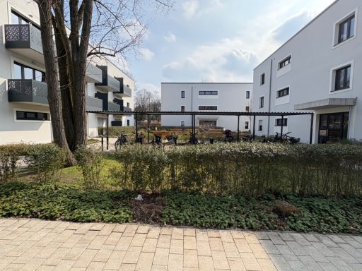 Die Praxis befindet sich etwas versteckt im linken Gebäude einer modernen Neubausiedlung.